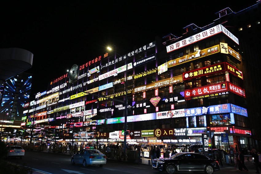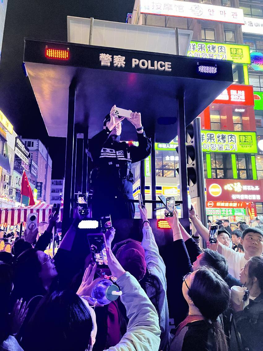作为城市标志性打卡点,延吉网红弹幕墙下始终人头攒动,游客们或驻足拍照,或录制视频,执勤民警化身“临时摄影师”,熟练调整角度帮游客定格美景。延大美食街夜市香气四溢,60个餐饮摊位一字排开,炒米肠、酱猪蹄、炸年糕等特色美食吸引游客排起长队,不少人一手举着烤肉串一手拍视频,记录热闹瞬间。